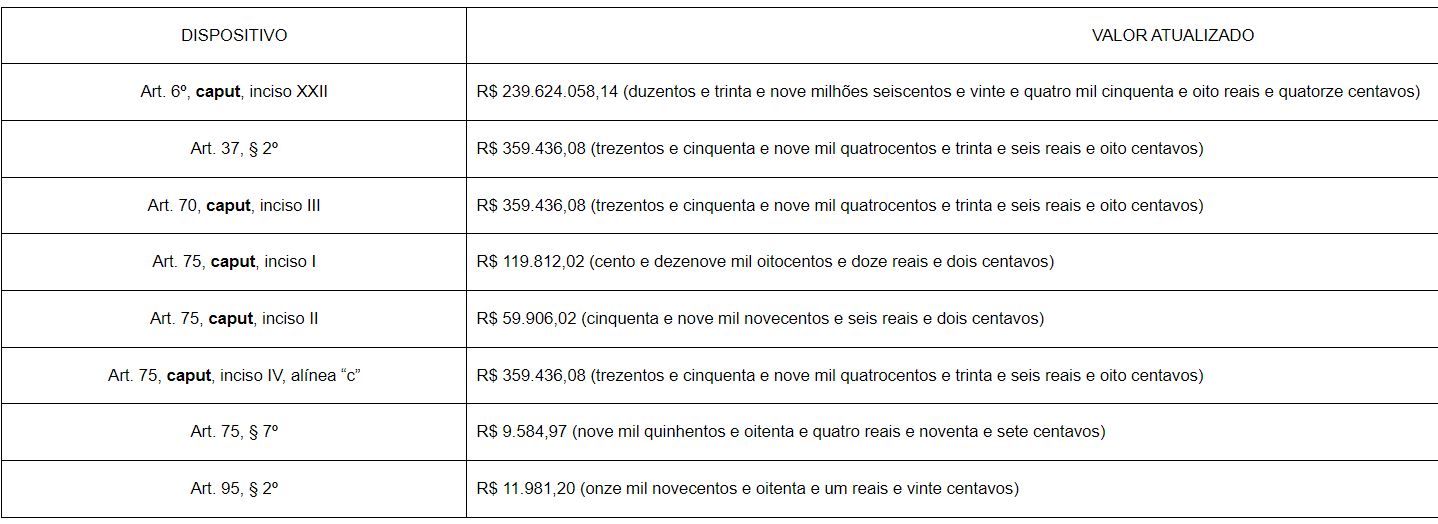 O Decreto 11.871 de 29 de dezembro de 2023 atualiza os valores da NLL para o exercício de 2024, em atendimento ao art. 182 da Lei 14.133/21, passando os valores prescritos nos incisos I e II do art. 175 da NLL (dispensa de licitação), para R$ 119.812,02 (obras e serviços de engenharia) e R$ 59.906,02 (compras em geral).